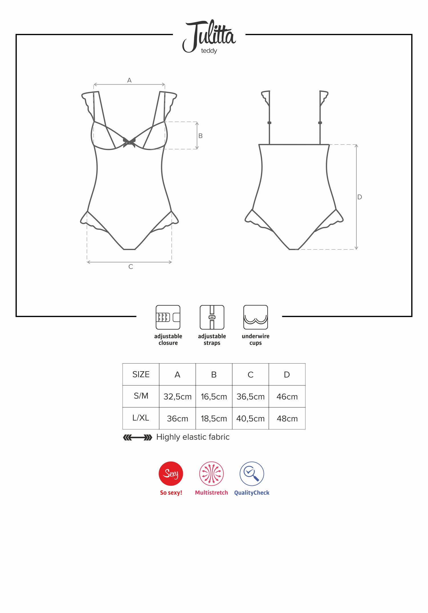 Have you been waiting for a teddy that will make your fantasies come true? You’re very close to getting it! Julita teddy invites you to discovering sensual pleasure. Let it caress your body with delicate mesh, lace and frills. Yes, it’s gonna be an amazing experience!