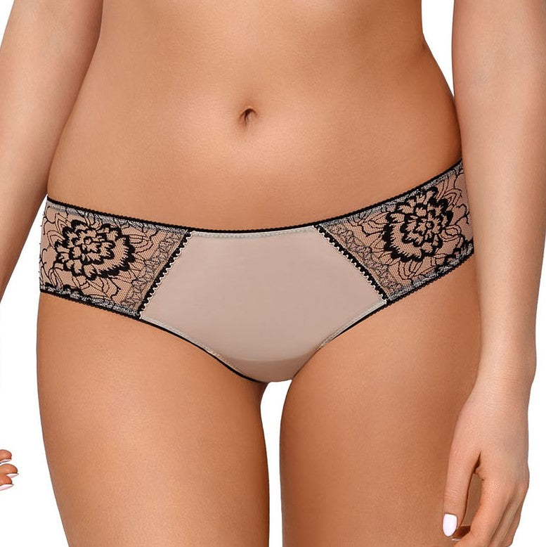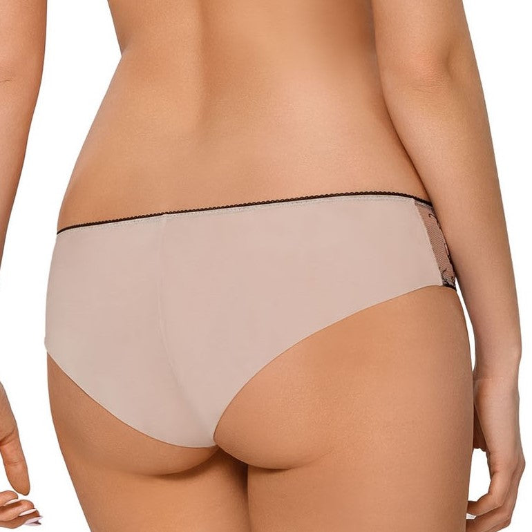 These brazilian bikini style panties have classy beige center and side panels in beige tulle black embroidered. Tulle inlays create pleasing image against the body’s contour. The back is made of beige double tulle layer with no stitching around the leg openings for no-show no-dig effect. This panties provider moderate coverage that highlights the buttocks for cheeky obviously sexy look.
