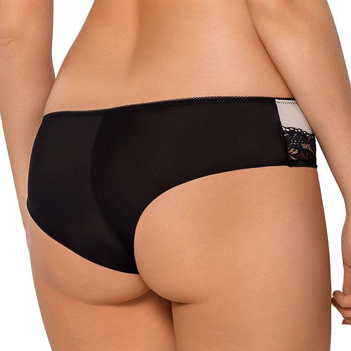 Contrasting colors, black lace and beige knitwear in the front speaks girl but more elegant. The style accentuates the body contours. Back finished in sexy double black mesh, accents the buttocks. No-dig no-show feature is yet another extra to this cheeky bikini. Flat finishes in the back- tulle mesh, seamless at leg openings offer comfort of wear and drastically spice up the look.