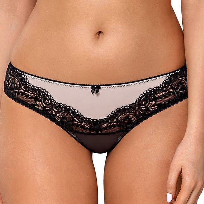 Inlay of beige microfiber adorned on each side with black Chantilly lace and decorated with single black bow. Creative design in V-shape accentuates body natural shape.  Finished with elastic band around the waist and leg openings. Back is made of stitched in the middle double tulle and provides moderate coverage. These thong panties in cheeky style, grant sexy look. Flat stitch free finish on the back makes the invisible under the clothes and comfortable to wear: no-dig no-show panties.
