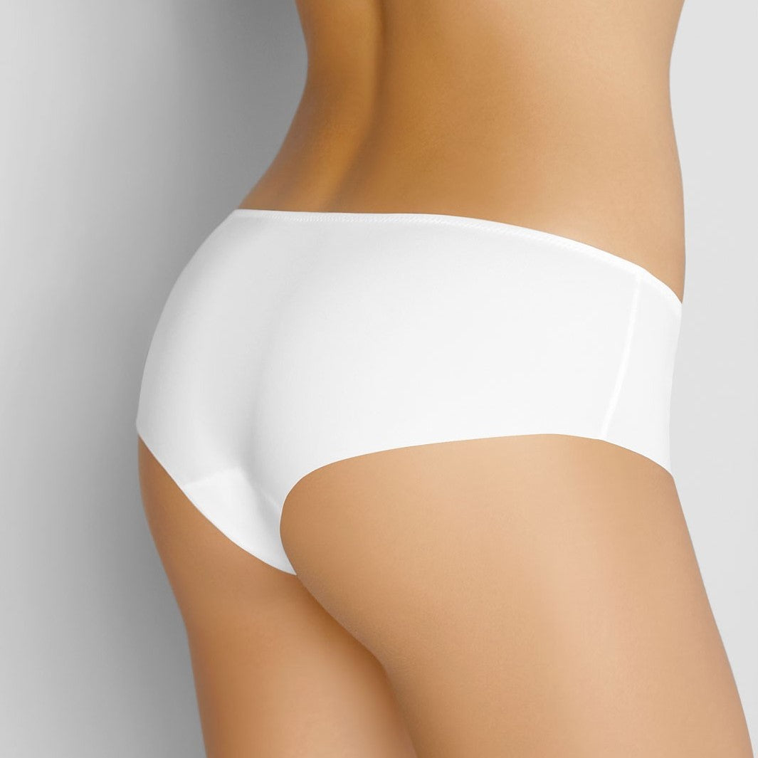 These cheeky hipsters are white no-show briefs. Hipsters are made of elastic tensile knitwear and smooth the body nicely. Medium back coverage creates the cheeky or Brazilian effect. This pair has only stitches on sides and by waistband. Flat edge, stitch- free on the leg openings make this pair disappear under your clothes. Gusset lined with 100% cotton.