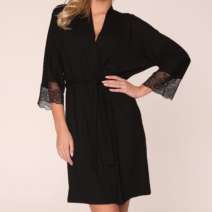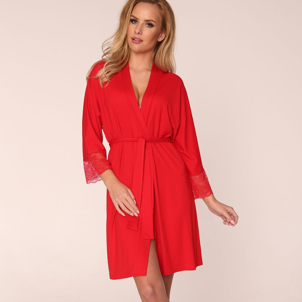 Night robe made of pleasant viscose and elastane blended knitwear. Simple lines, roomy fit, flat finished seems, and envelope style closure says it all. Sleeves are finished with openwork lace in a floral motif. Slightly elongated back adds some flair to this ultra-soft and feminine nightshirt. Perfectly balanced simple and spicy all you need for everyday awesome nights!
