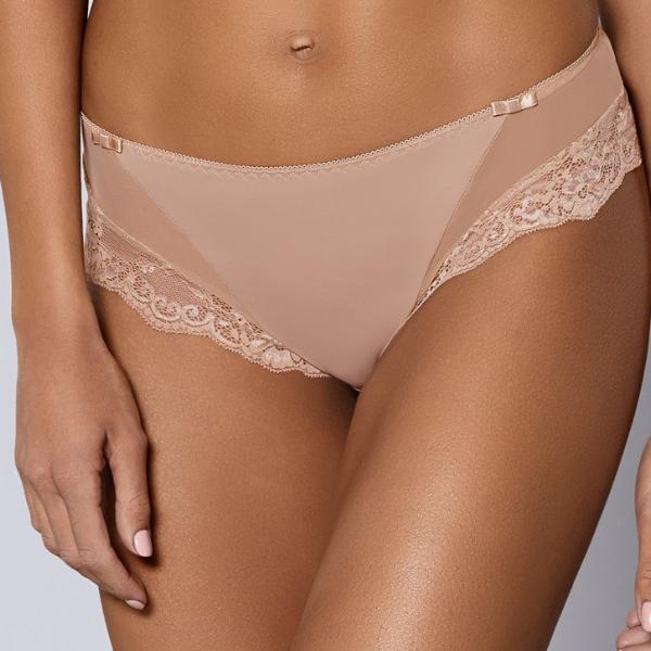 This pair is made of superb elastic knitwear trimmed with exquisite flowery lace. The front and back center panels are made of knitwear that echoes the body’s natural shape. Interconnected knit, mesh and lace create nice pattern in the front. The wide panels of lace are used to finish the leg openings. Thanks to the width of lace, this pair is no-show and no-dig. The entire design is pleasing cut, but the inventive combo of materials and their unusual application adds definite spice to the final look. Even a bit more coverage can be spicy hot!