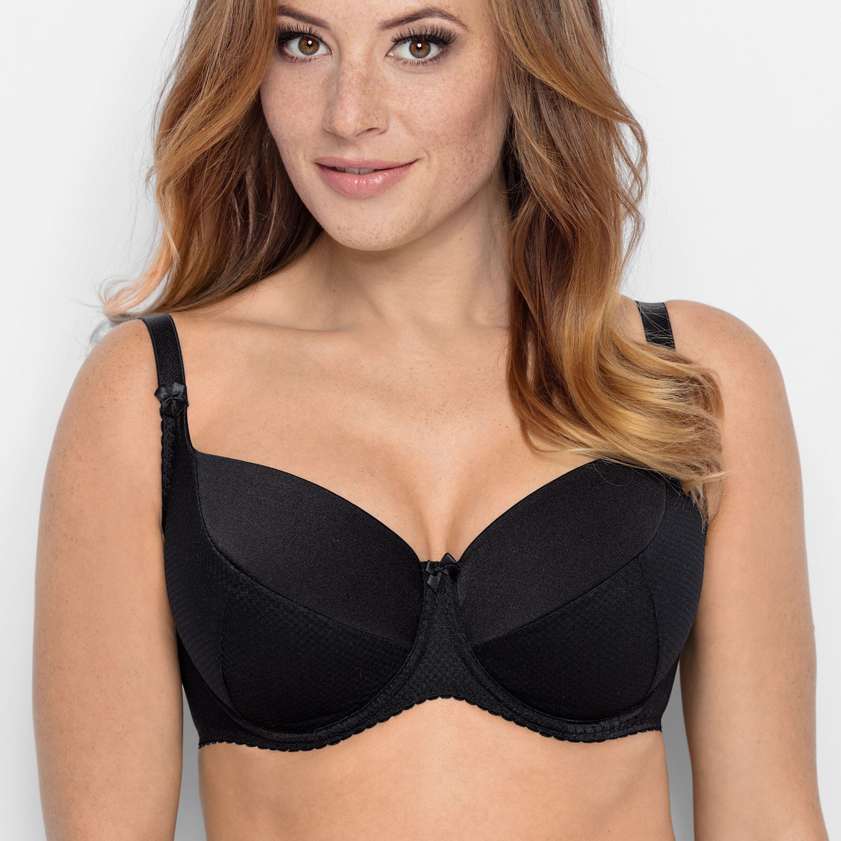 Timeless, stylish model. Who does need or like the classic solution? This bra is fully lined with a thin light foam and finished with 100% cotton on the inside. It has been made from a slightly shiny high-quality knitted fabric. Two fabric combination features solid black on the top and diamond patterned one on the bottom of the cups. The construction very nicely collects and forms the bust. Multiple parts cups and higher bridge provide added support and enhancement. Three-tier adjustable closure of the double row hooks and the lateral boning in larger sizes (from the 36), are additional attributes of this bra. Permanent straps are decorated with tiny bows. Composition: Polyamide 69%, Elastane 5%, Cotton 18%, Other 8%