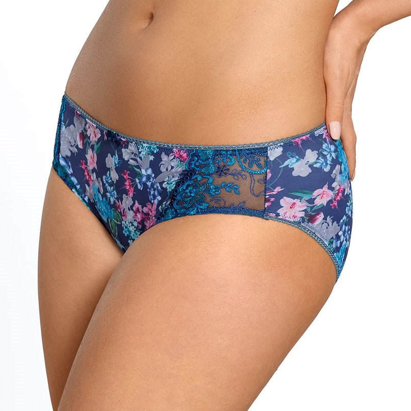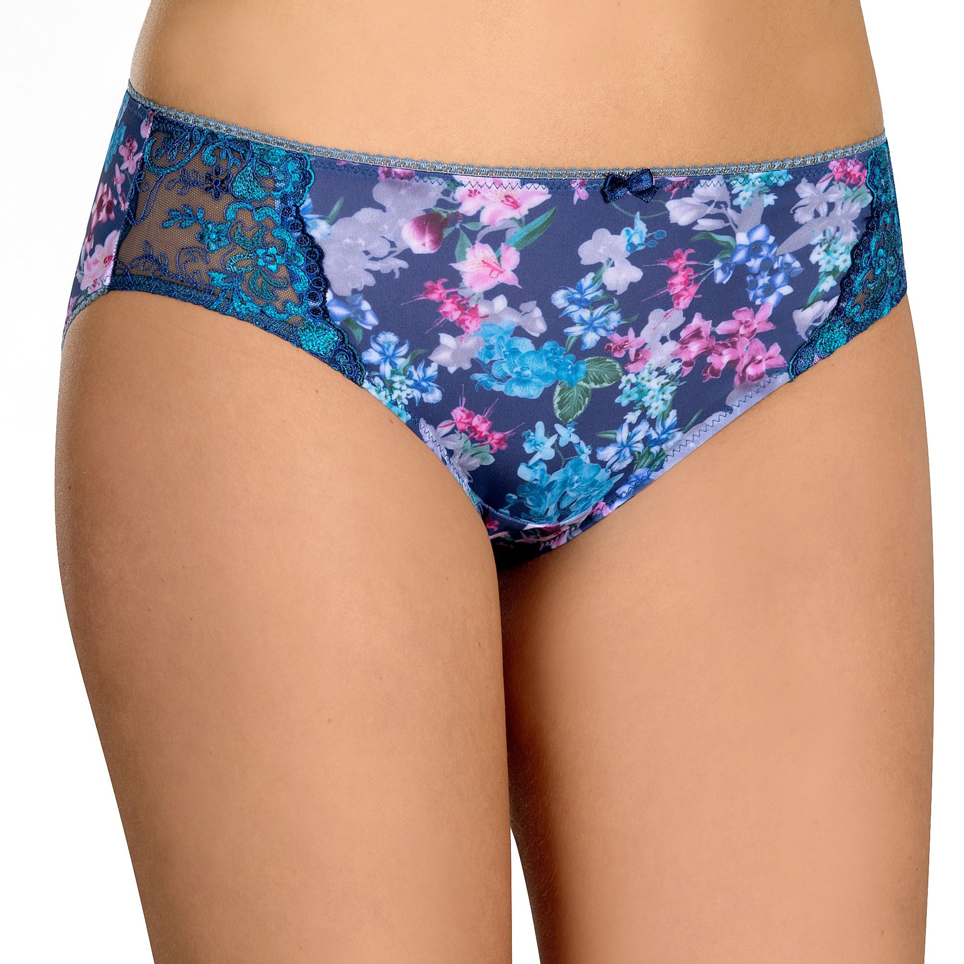 These bikinis are made entirely from multicolored elastic knitwear in happy and warm flowery pattern. Symmetrical hip inlays are made of two-tone embroider lace, with colors intensifying into flowery outline on the front edges. The placement of the inlays eliminated the side seams which make these panties extra comfortable without stitches on the sides. Trimmed with coordinated blue elastic tape and gusset lined with 100 % cotton. Detailed finish, light fabrics and bright print created one joyful looking underwear!