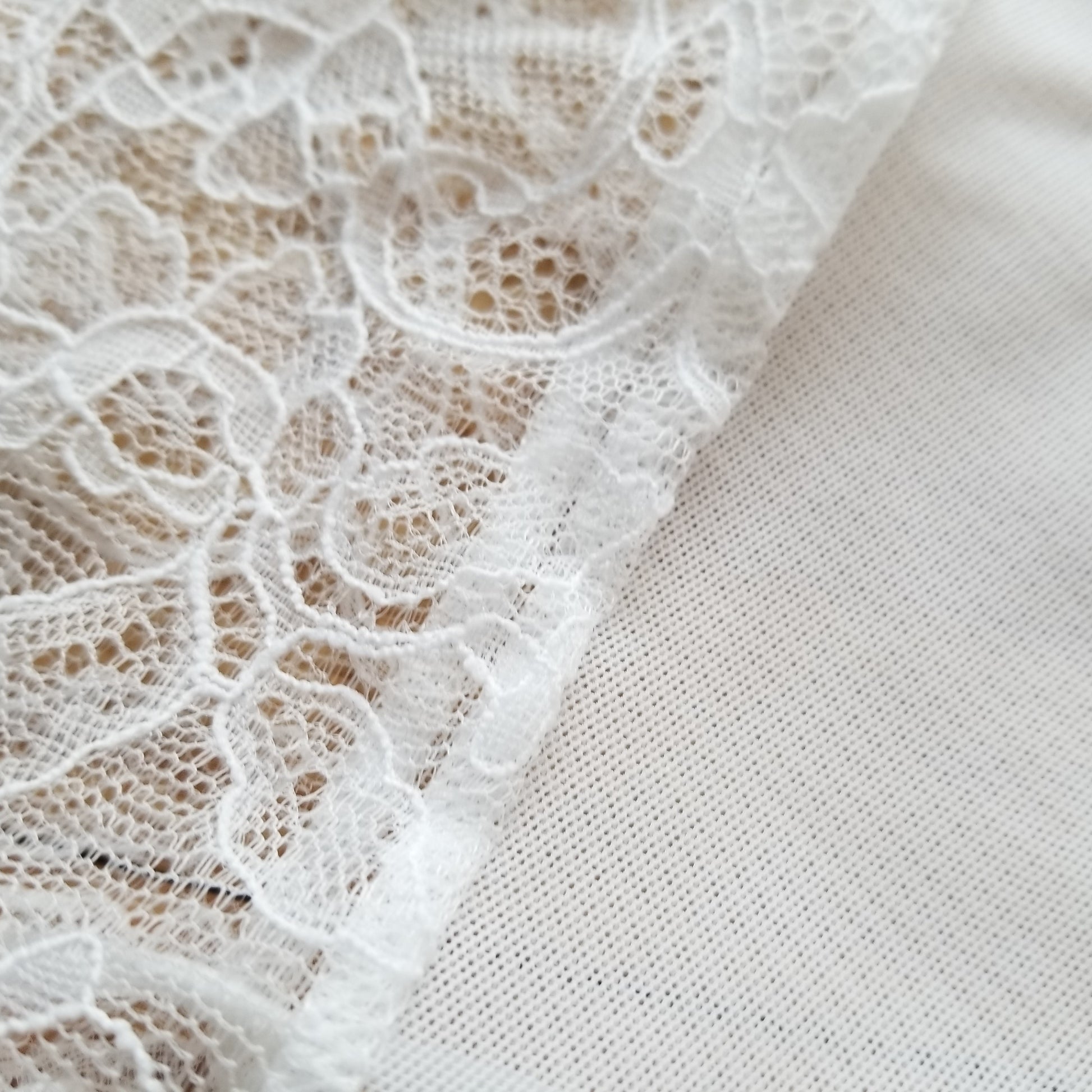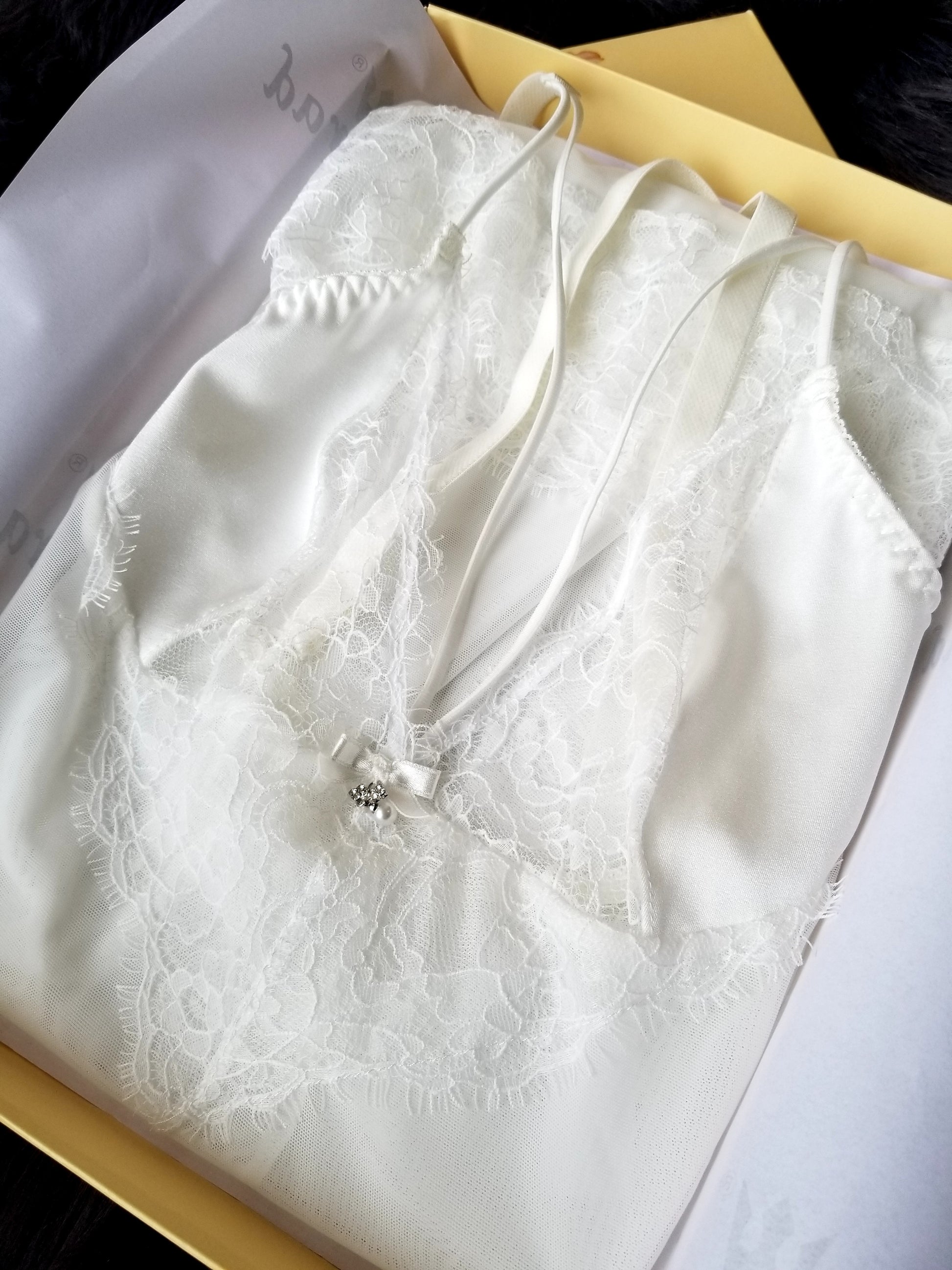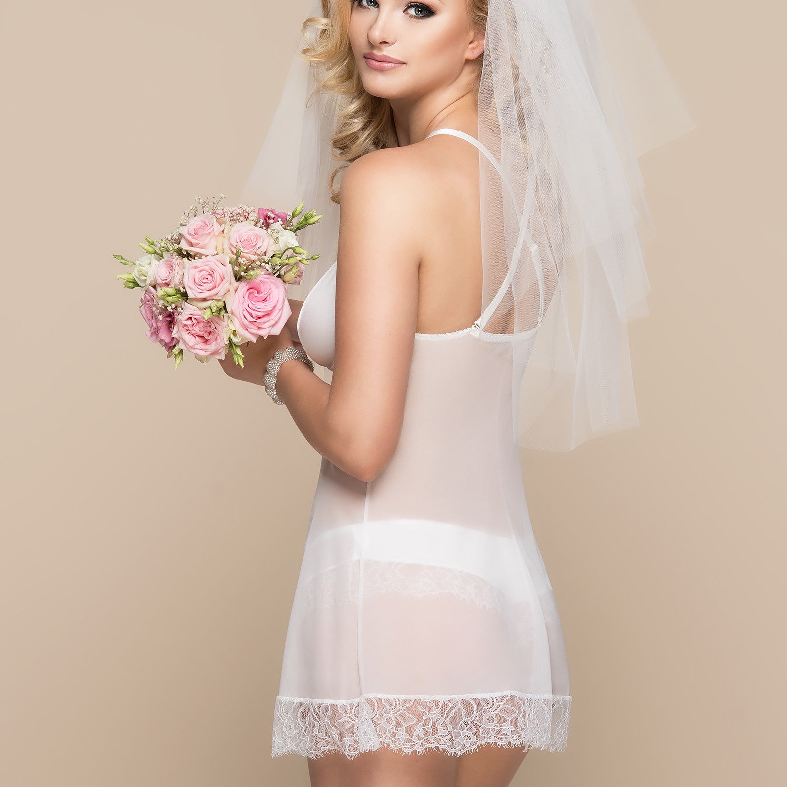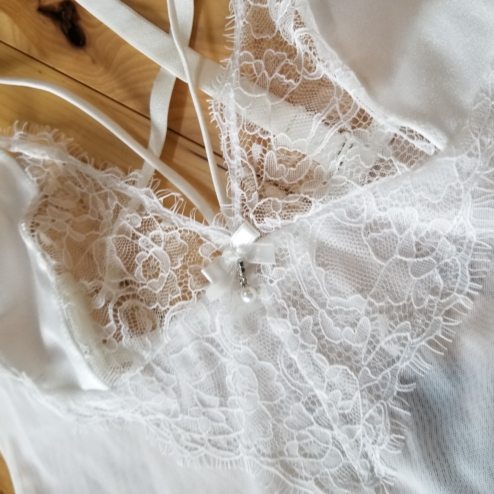 This ultra-sensuous chemise is made of semi-transparent white knitwear. Soft cups with vertical seam, are in half made of this ephemeral flowery lace which continues under the cups. The small bow with pendant between the cups, connects with spaghetti straps for cage like magnificent effect. Adjustable straps can be crisscrossed for better control. Simple in cut and line design is nothing shy from spectacular. The last component of this beauty is adorned with the spectacular lace bottom hem giving in it even more airy feeling. Feel like in a dream in this dreamlike chemise.